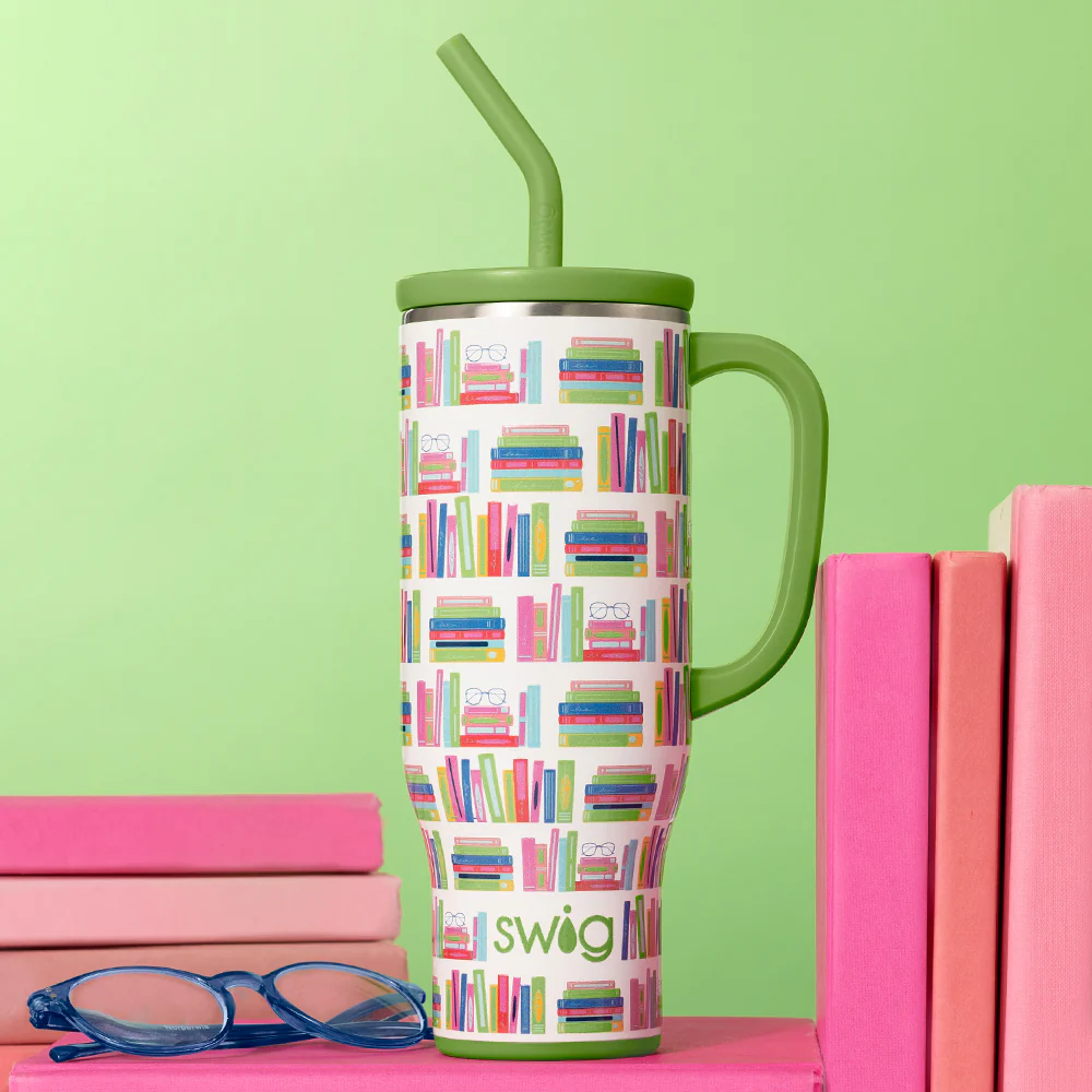 Mega sips, mega chill! 🧊 This cup is a page turner! 📚 Vintage-colored books line up on a glitter parchment background to provide the coziest reading companion.