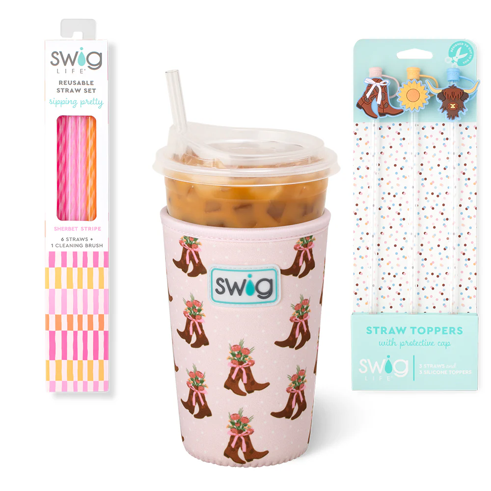 Accessory Bundle includes: one insulated Iced Cup Coolie with handle, one Reusable Straw set of 6 printed straws, and one Straw Topper set of 3 reusable straws with silicone charms featuring protective caps. Keep them all for yourself or share them with a friend!