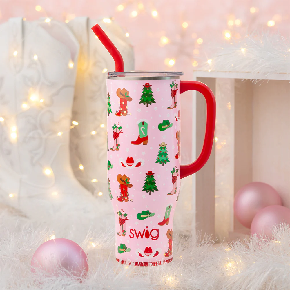 Mega sips, mega chill! š§ Boots + Bling, it's a Holiday thing! Say Howdy to country boots and hats trimmed with gold accents, and snow white fur.