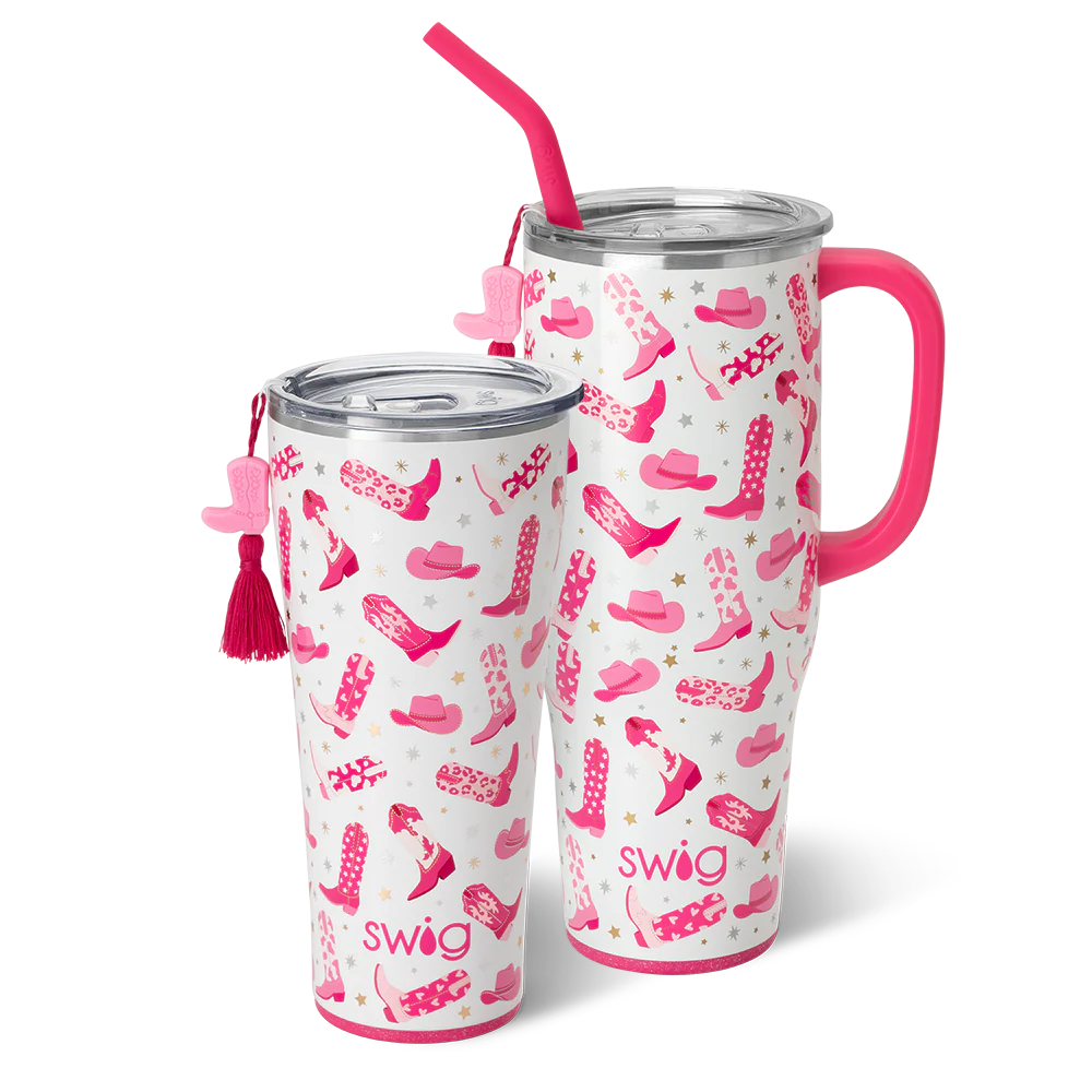 Bigger is better! Embrace your inner Dolly or Shania with pink cowgirl boots and hats on shimmer white background paired with glitter silicone base.