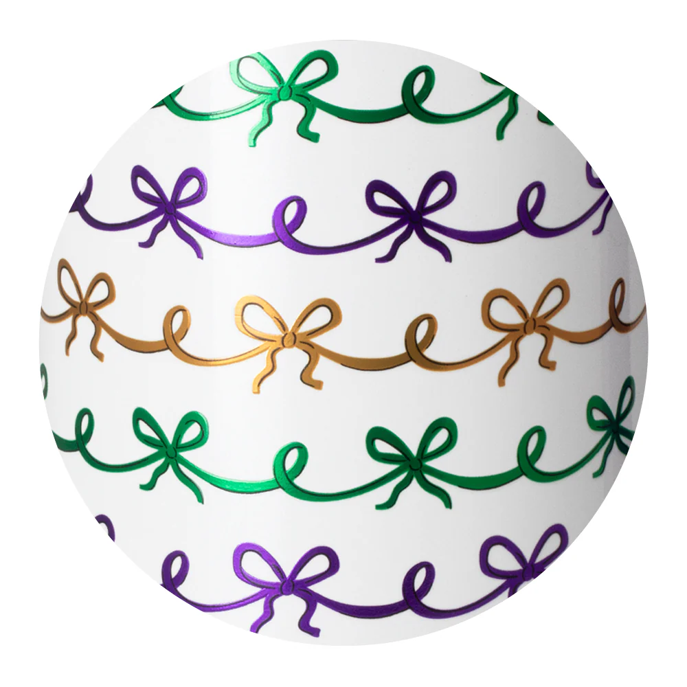 Cold sips, no sweat! 💧Bring on the bows, beads, and bourbon with this Mardi-ready print, featuring purple, green, and gold metallic bows on a glitter white background.