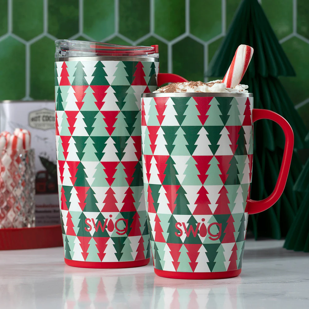Take a "swig" of whatever fuels your day! ☕🚗 Red, mint, ivory, and green geometric pine trees create a sophisticated Christmas design. 🎄