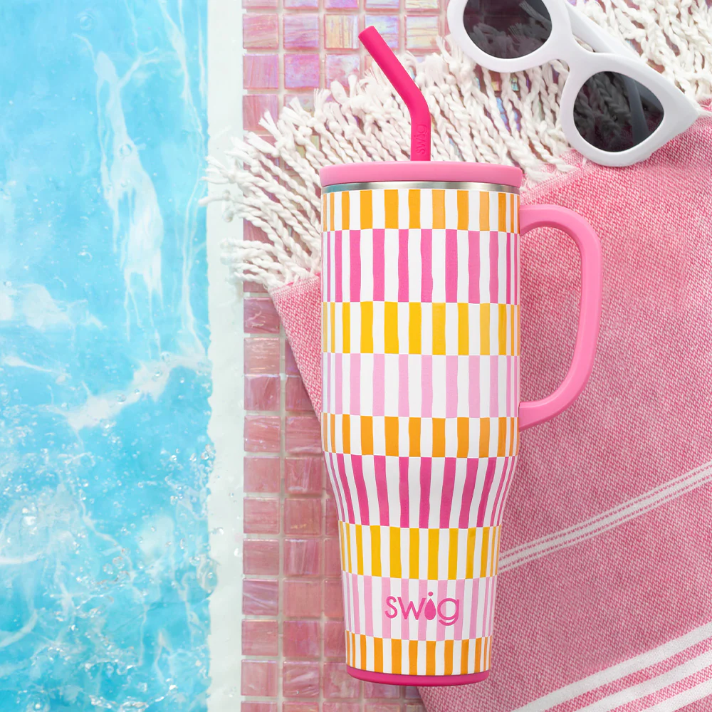 Mega sips, mega chill! 🧊 Bright pinks and oranges reminiscent of hot summer days come together to create a bold cabana stripe design on pale blush background.